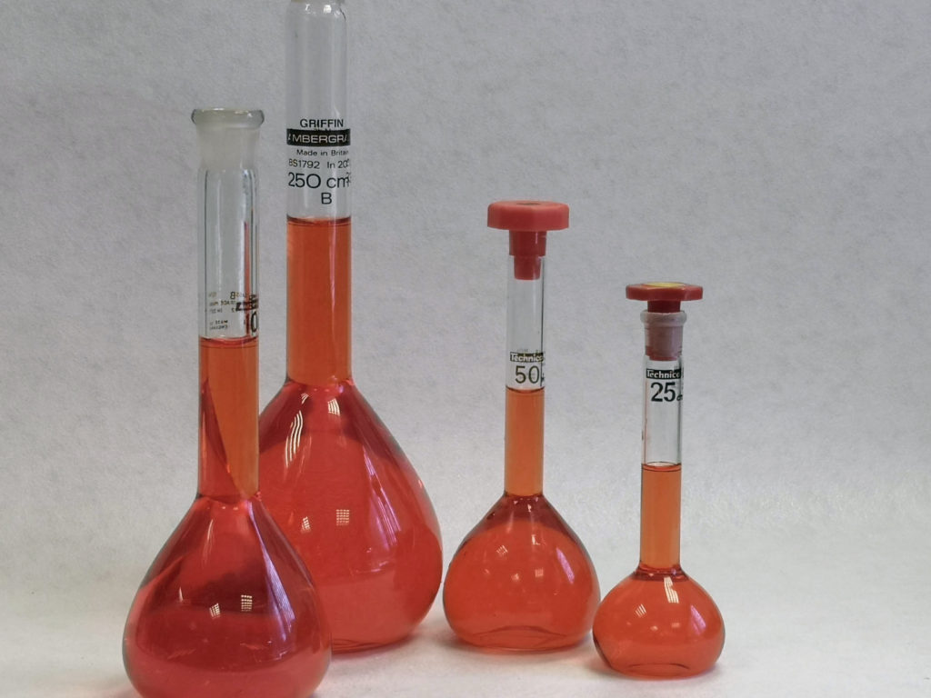 Volumetric flasks – These are flasks with a very accurate line drawn round the neck at a certain volume. If you are making up accurate solutions, you should use these.